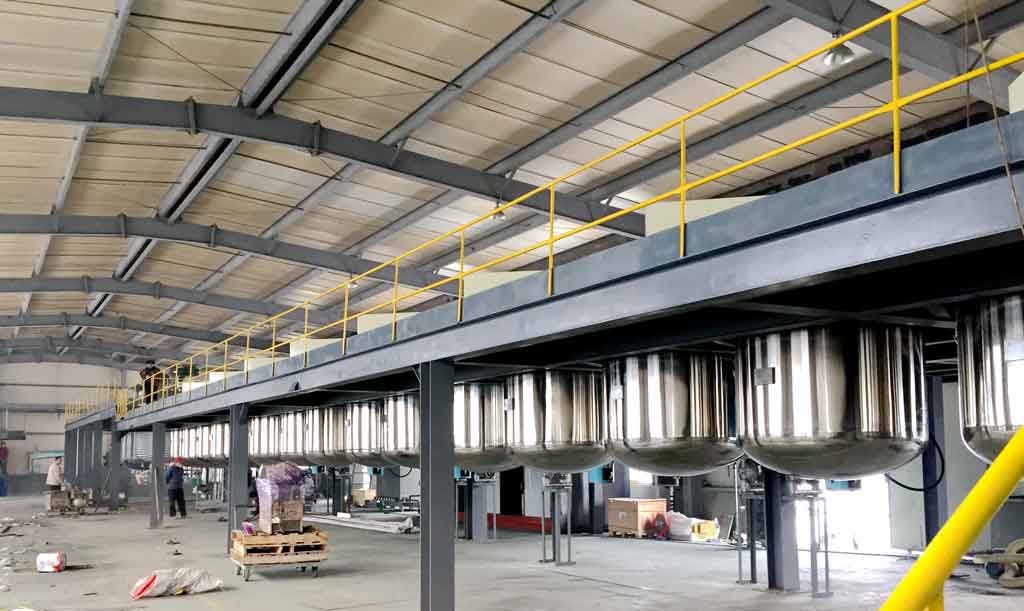 環(huán)氧地坪生產(chǎn)線自動配料,解決配料環(huán)節(jié);粉體料隔間螺旋輸送,解決粉體配料粉塵問題;一機(jī)雙缸生產(chǎn)釜8套(16個(gè)釜),滿足不同色系、品種綜合生產(chǎn)問題;升降分散機(jī)方便釜體清洗。