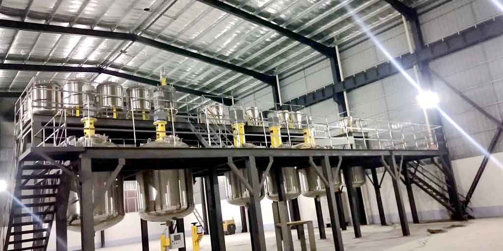 乳膠漆、真石漆產(chǎn)線布置:立體空間布置,三層投粉間、助劑配料間、乳液儲(chǔ)存配料間;二層生產(chǎn)平臺(tái),一層全自動(dòng)包裝。