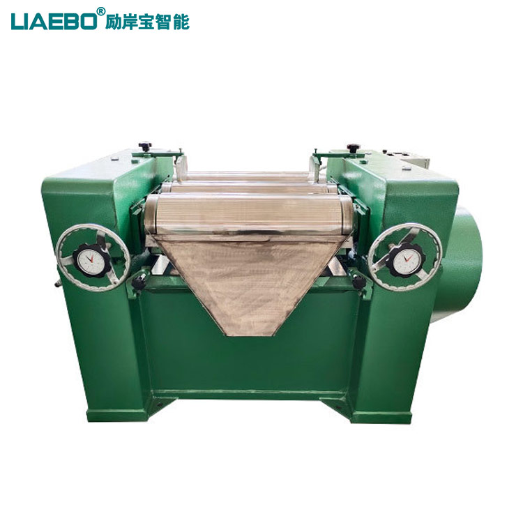 三輥研磨機主要用于各種油漆、油墨、顏料、塑料、食品等膏狀漿料之用,主要為油漆、油墨等高粘度物料的研磨分散之主要設備。該機通過機器水平方向排列的三根輥筒表面相互擠軋及不同的速度的摩擦而達到研磨作用,研磨物料一般只要研磨二次就可以達到要求,難研物料必須研磨多次,方能達到要求。工作時間快、慢輥調節到適當位置,啟動機器,然后將需要研磨的漿料加入中輥與慢輥之間銅刀處,漿料經過中、慢輥表面擠軋后,由中輥帶給快輥,再由緊貼表面的出料刮刀予以刮下,通過裝有欄板的刀板,流入盛料筒,由此構成整個研磨的過程。